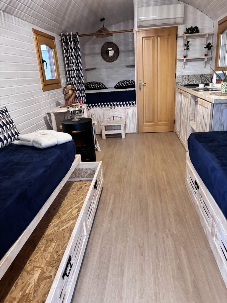Dans une roulotte, chaque meuble doit idéalement avoir une double utilité. Une banquette coffre permet de stocker des plaids ou des chaussures. Un lit avec tiroirs accueille linge de lit, vêtements hors saison ou accessoires. Une table rabattable libère la circulation lorsque vous ne mangez pas. Les assises avec rangements intégrés sont aussi très efficaces pour cacher le quotidien tout en gardant l’essentiel à portée de main.